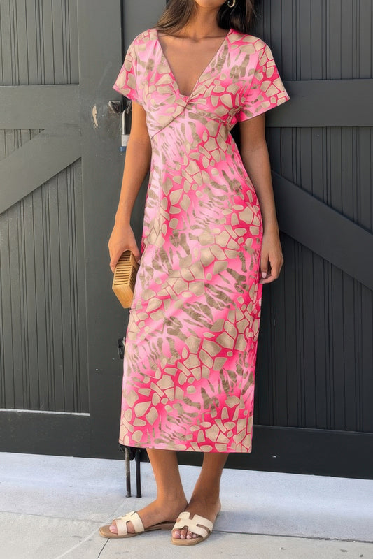 Geometric Print Twist Design Short Sleeve Fit Dress